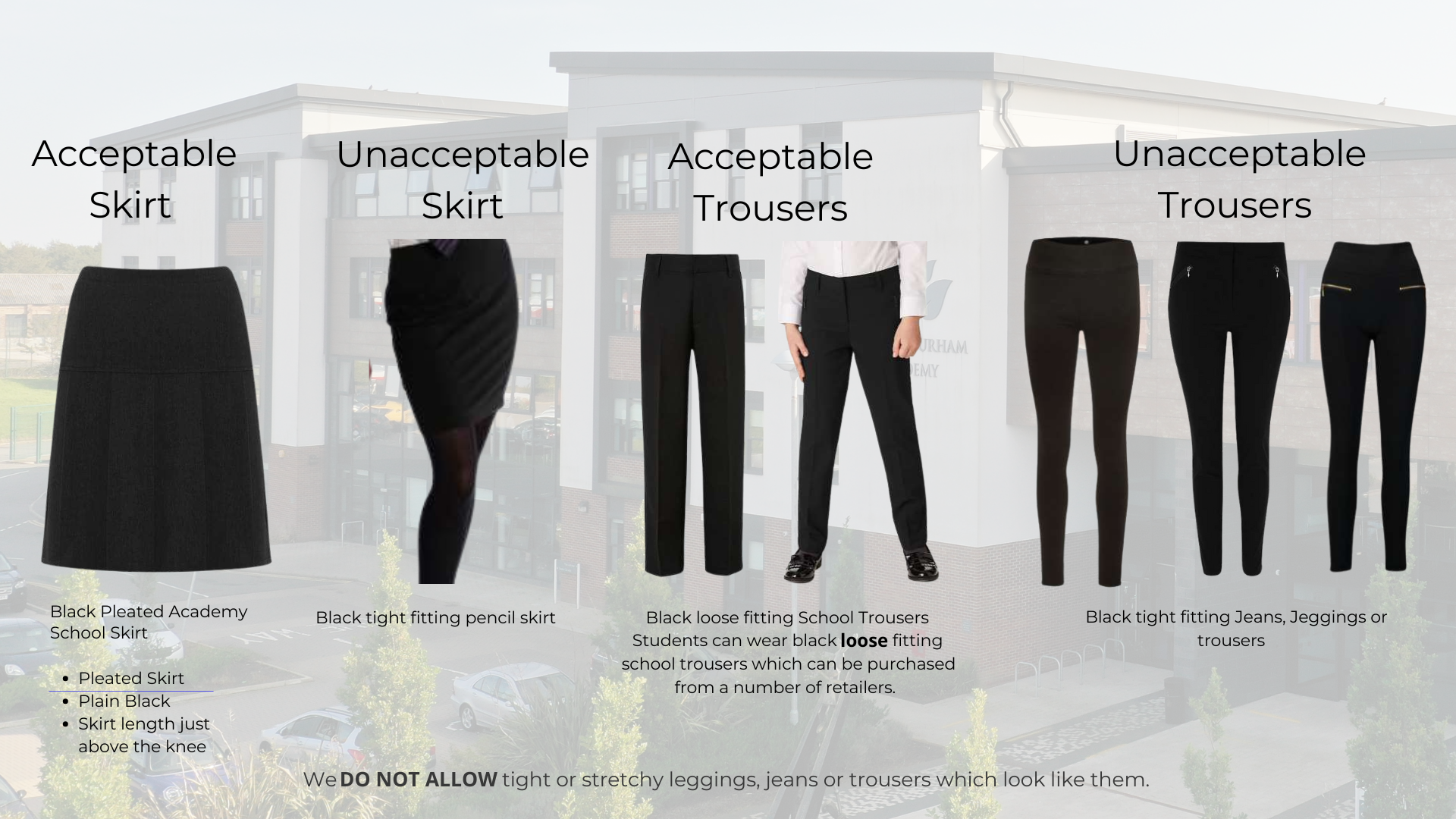 Please note that chain stores may sell items as school uniform, which are not acceptable at North Durham Academy. We DO NOT ALLOW tight or stretchy leggings, jeans or trousers which look like them.