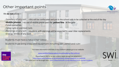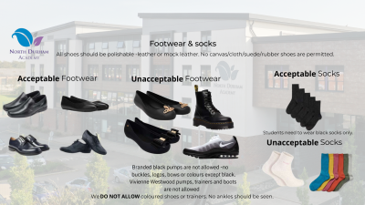 Standards at North Durham Academy are extremely high, and this starts with the way your child presents themselves to school. Academy uniform is compulsory, and exceptions cannot be made if your child attends school not dressed in full Academy uniform.